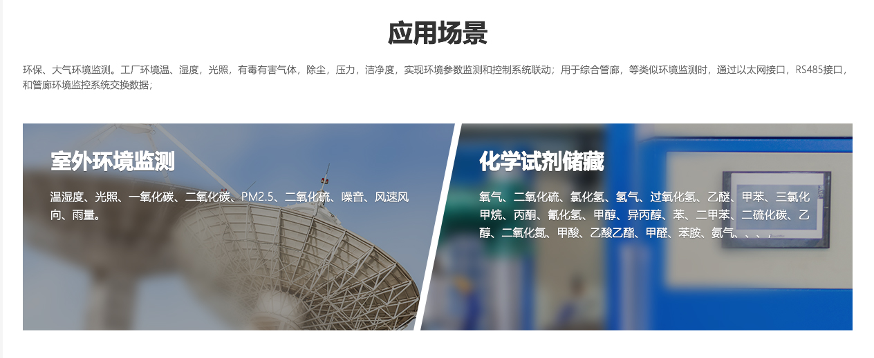 環保、大氣環境監測。 工廠環境溫、濕度,光照,有毒有害氣體,除塵,壓力,潔凈度,實現環境參數監測和控制系統聯動; 用于綜合管廊,等類似環境監測時,通過以太網接口,RS485接口,和管廊環境監控系統交換數據;