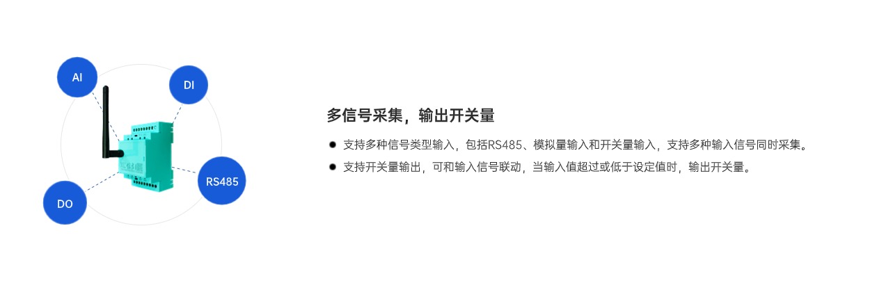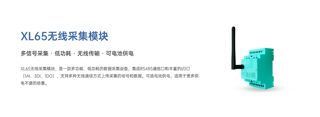 XL65無(wú)線(xiàn)采集模塊,是一款多功能、低功耗的數(shù)據(jù)采集設(shè)備,集成RS485通信口和豐富的I/0口(1AI、3DI、1DO),支持多種無(wú)線(xiàn)通信方式上傳采集的信號(hào)和數(shù)據(jù)??蛇x電池供電,適用于更多供電不便的場(chǎng)景。