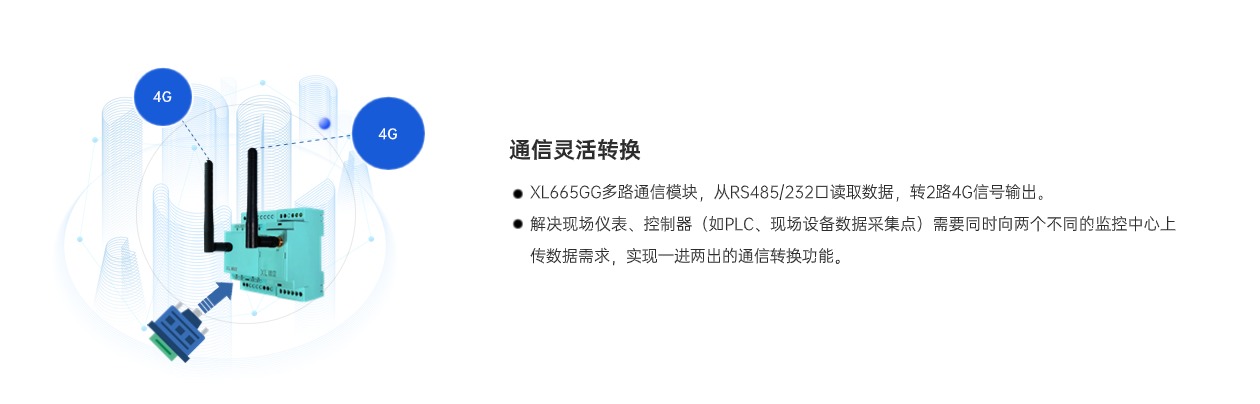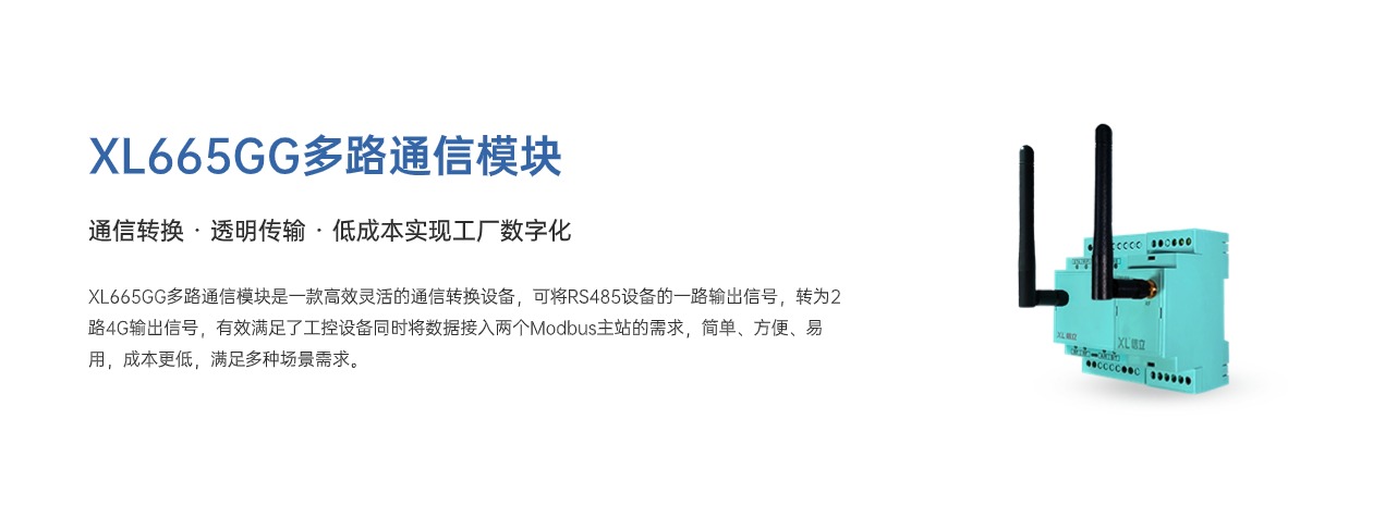 XL665GG多路通信模塊是一款高效靈活的通信轉(zhuǎn)換設(shè)備,可將RS485設(shè)備的一路輸出信號(hào),轉(zhuǎn)為2路4G輸出信號(hào),有效滿足了工控設(shè)備同時(shí)將數(shù)據(jù)接入兩個(gè)Modbus主站的需求,簡(jiǎn)單、方便、易用,成本更低,滿足多種場(chǎng)景需求。