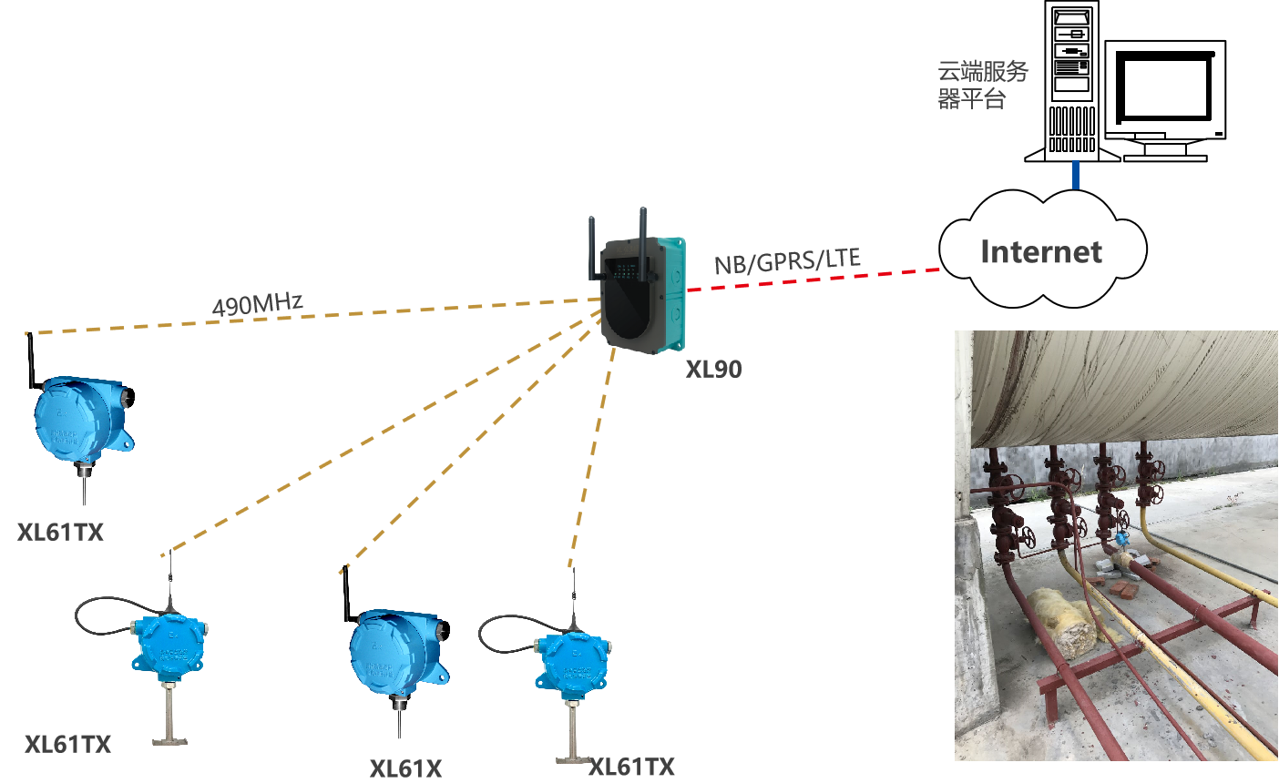 選擇XL90物聯網關,無線讀取監測點的數據,進行協議、通訊轉換后,推送至上層軟件平臺