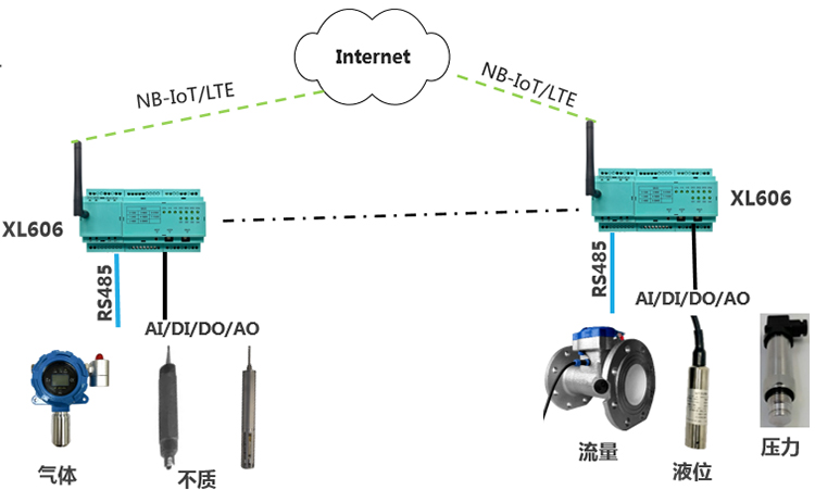 選擇XL60主機模塊,加I/O模塊,采集環保設備的運行信號;通過RS485/Ethernet接口,從機器控制器、PLC讀取設備運行數據;通過NB/4G上傳數據到平臺,4G網絡信號更穩定;