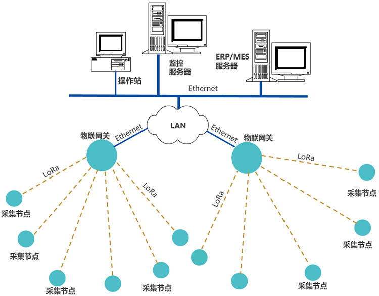 每臺裝置,通過LoRa無線通訊上傳數(shù)據(jù)至物聯(lián)網(wǎng)關(guān),網(wǎng)關(guān)通過Ethernet或Wi-Fi,接入LAN,推送數(shù)據(jù)至企業(yè)生產(chǎn)管控服務(wù)器。