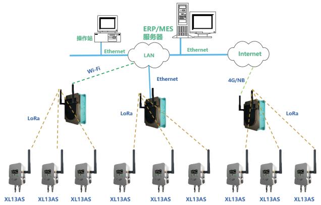 XL13AS 無線風管風速傳感器通過 LoRa 無線傳輸方式,將數(shù)據(jù)上傳至 XL906 物聯(lián)網(wǎng)關 ,網(wǎng)關可選以太網(wǎng)、 Wi-Fi 、 4G 通信方式,推送數(shù)據(jù)至監(jiān)管平臺、企業(yè)生產(chǎn)管控服務器等。