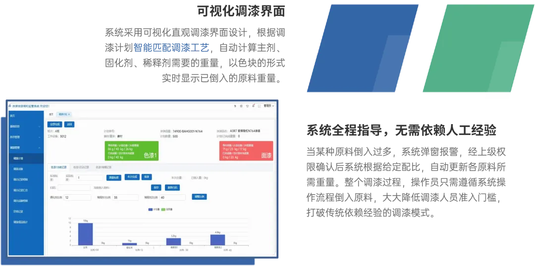 在傳統(tǒng)的調(diào)漆和制漆過程中,過于依賴個(gè)人經(jīng)驗(yàn)技能,靠師傅帶徒弟的方式培訓(xùn),人為因素容易導(dǎo)致調(diào)漆質(zhì)量不穩(wěn)定、風(fēng)險(xiǎn)大;漆料選用、使用、調(diào)漆操作等都依賴人工記錄,導(dǎo)致質(zhì)量問題無法追溯、漆料浪費(fèi)大、統(tǒng)計(jì)數(shù)據(jù)不準(zhǔn)確等問題。