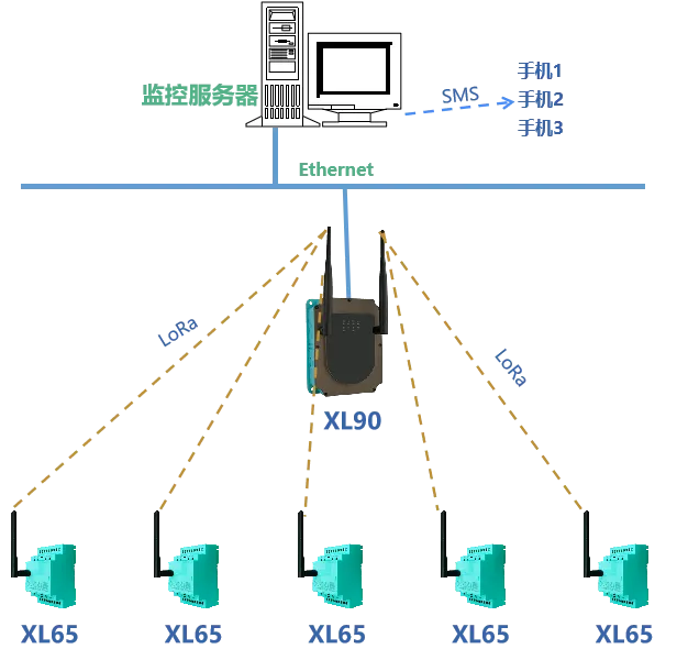 XL65通過LoRa無線上傳數(shù)據(jù)至XL90物聯(lián)網(wǎng)關(guān),XL90通過Ethernet接入監(jiān)控服務(wù)器或企業(yè)MES系統(tǒng)。
