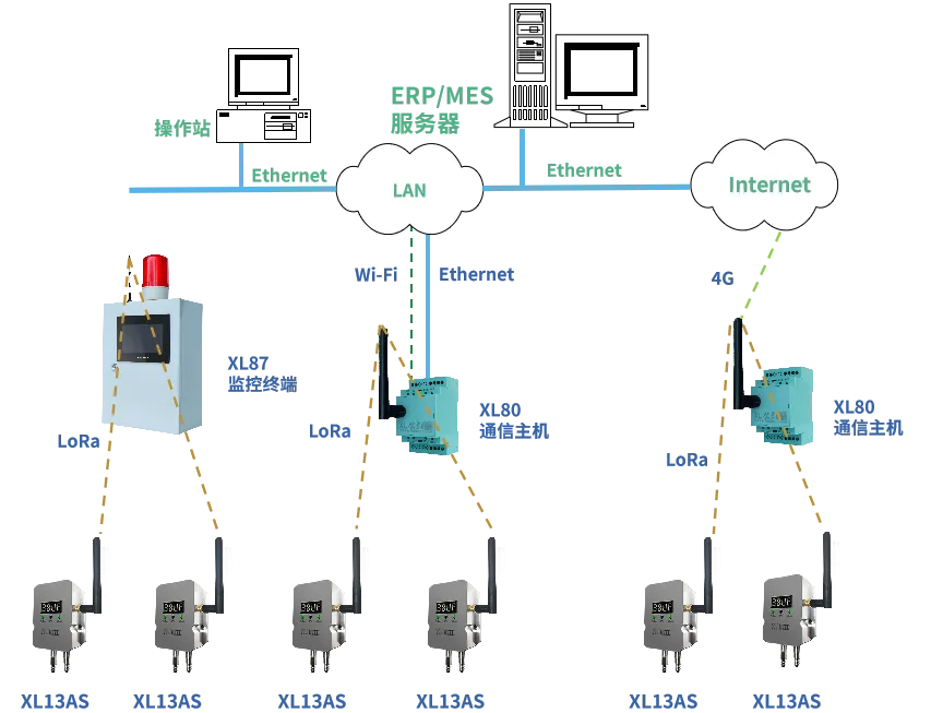 XL13AS無(wú)線風(fēng)管風(fēng)速傳感器通過(guò)LoRa無(wú)線傳輸方式,將數(shù)據(jù)上傳至XL802通信主機(jī),通信主機(jī)可選以太網(wǎng)、Wi-Fi、4G通信方式,推送數(shù)據(jù)至監(jiān)控平臺(tái)、企業(yè)生產(chǎn)管控服務(wù)器等。