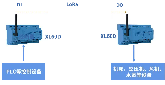 一對XL60D無線開關量對傳模塊,其中一臺與PLC等控制儀表連接,作信號發(fā)射端;一臺配置在生產現場,作信號接收端。發(fā)射端的XL60D將控制儀表的啟停命令,通過LoRa無線對傳到接收端,接收端的XL60D輸出開關量信號,控制設備啟、停。